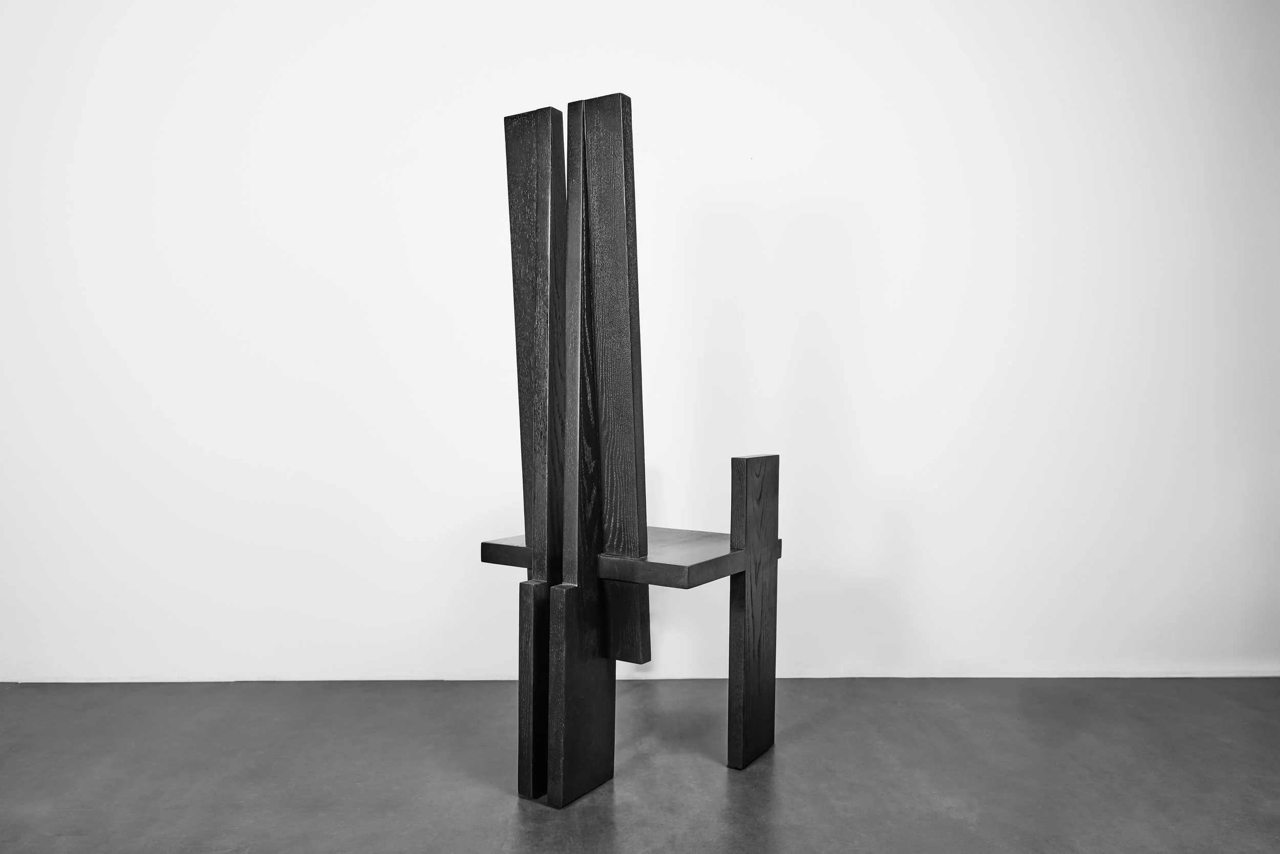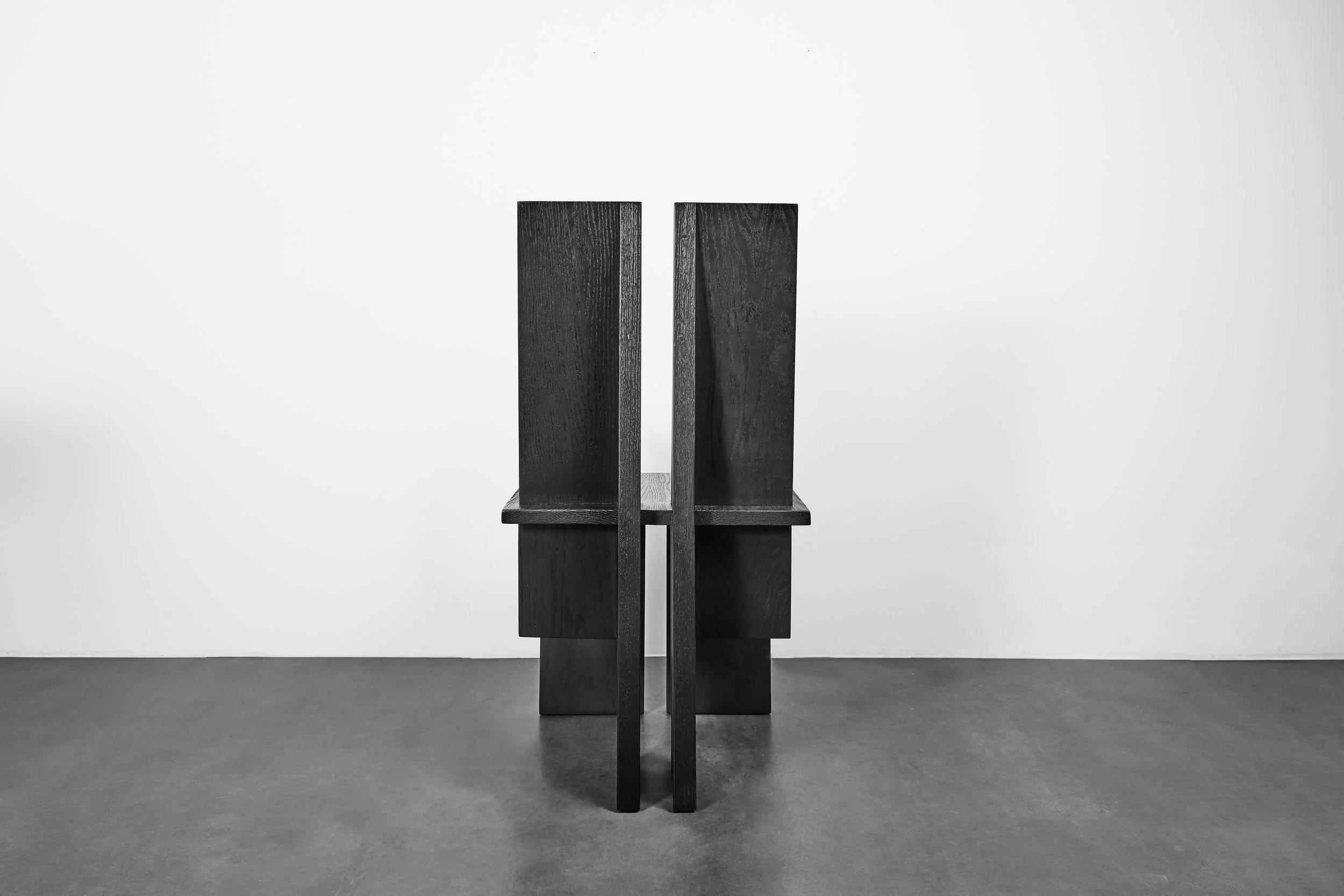 The collection draws from the sensibilities of brutalist architecture—its heavy stature and authority jump out at first glance. Elegance plays with this domination through the silhouettes of the chairs, their forms nodding to Japanese joinery techniques for inspiration. There is a logical and secure feeling here, but also a sense of mystery.