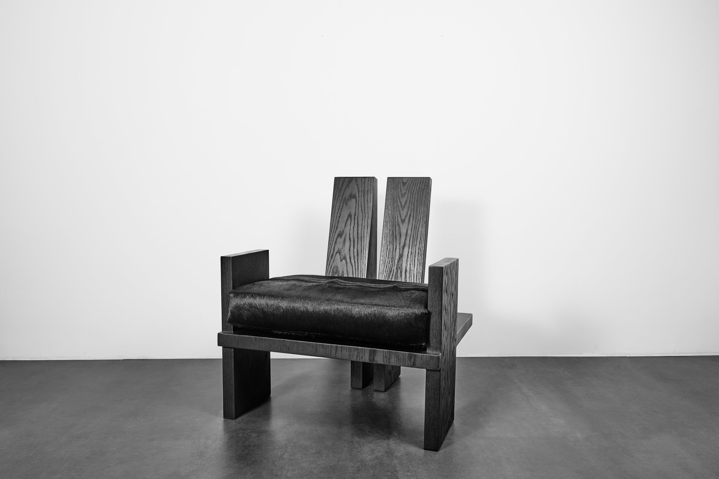 This collection presents uncomplicated materials with straightforward construction—and this isn’t surprising considering Urribarri’s oeuvre. The artist has long explored rawness and form through his sculpture and painting, and will be continuing this exploration through the medium of furniture making. The Quadrat chairs are stained solid oak wood, with the lounge chair featuring a black cow hide seat. The collection comprises four different styles: two dining chairs, a lounge chair, and an accent chair.